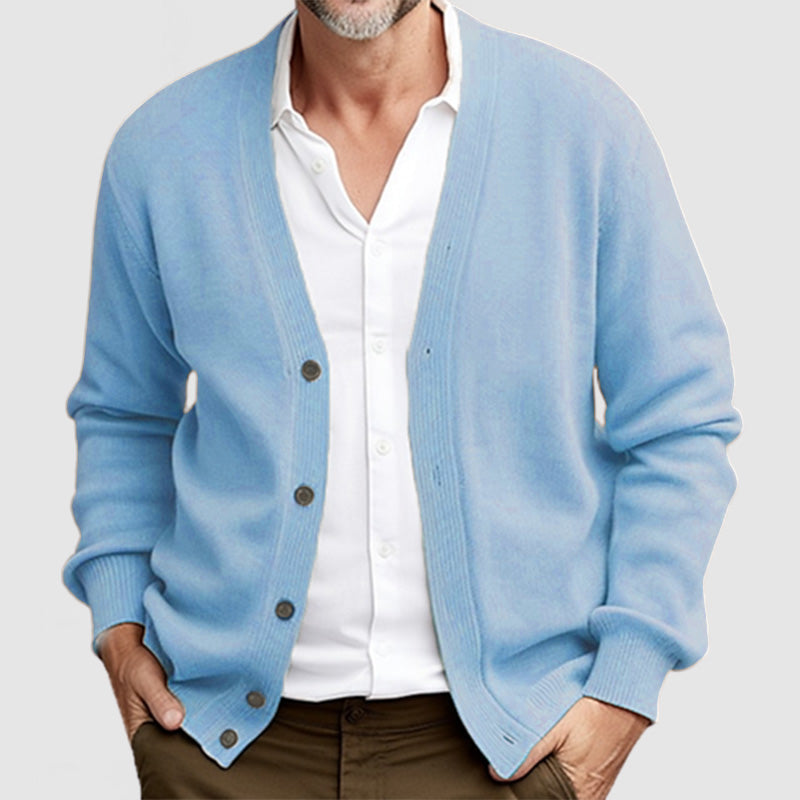 Ten sweter charakteryzuje się klasycznym wzorem dzianiny i zapięciem na guziki. Posiada dekolt w kształcie litery V oraz ściągacze na mankietach i u dołu. Zaprojektowany z myślą o warstwowym ubiorze i wszechstronnym noszeniu przez cały rok.