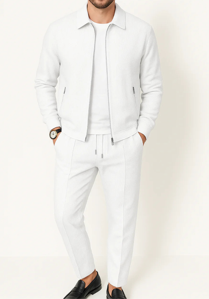 Dzięki dopasowanej kurtce na zamek i idealnie dobranym spodniom, ten komplet łączy swobodę z klasą – idealny na spacer po mieście, podróż służbową czy stylową kolację.